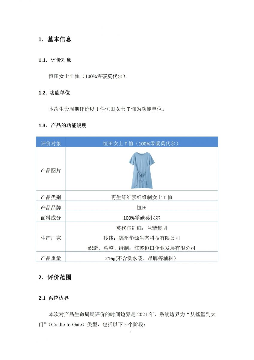德州華源生態(tài)—恒田女士莫代爾T恤碳足跡報(bào)告